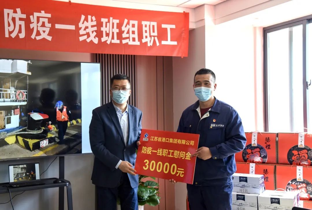 在南京港江北集裝箱公司,關(guān)永健向疫情期間堅(jiān)持奮戰(zhàn)在疫情一線的“安全班”班組職工送上了慰問(wèn)金和慰問(wèn)品。