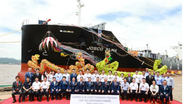 6月28日,江蘇遠洋投資建造的1100箱位新型節(jié)能環(huán)保集裝箱船“江遠遠誠”輪在舟山常石船廠命名交付。南京市交通運輸綜合執(zhí)法監(jiān)督局五支隊支隊長閆冰、副支隊長潘新保,江蘇省港口集團黨委組織部副部長魯運生、群眾工作部副部長蔡正融,江蘇遠洋黨委書記、董事長晁陽,總經理、黨委副書記戴偉,省港口集團集裝箱公司副總經理潘元兵,集團航運事業(yè)部副部長劉冰,常石集團(舟山)造船有限公司總經理佐藤二郎、常務副總經理村上佳史出席命名交付儀式。