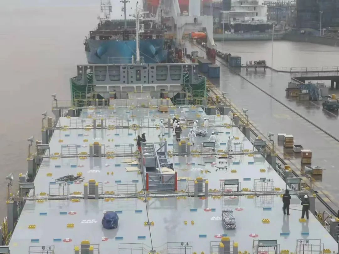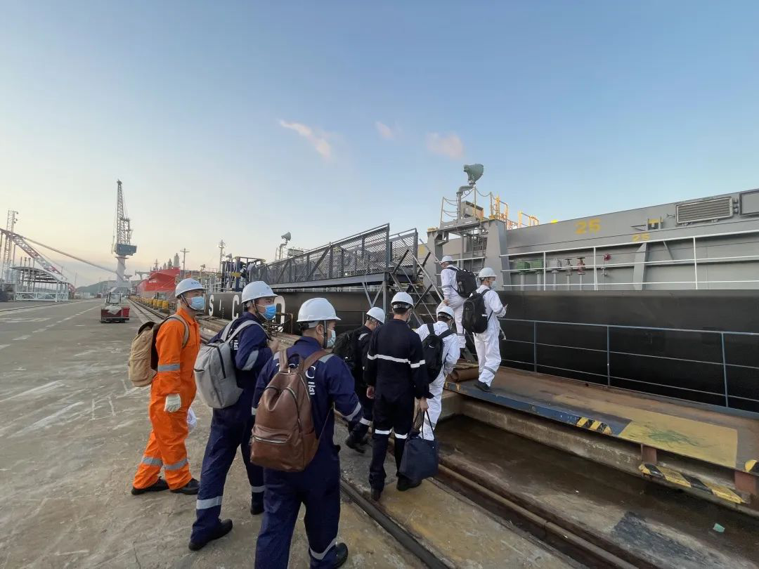經(jīng)過三天兩次核酸檢測,我們29日凌晨五點半到達(dá)了常石船廠,在青山碼頭邊終于看到了我們心心念念的新造船—”江遠(yuǎn)遠(yuǎn)慧“輪,嶄新的一切,同事們登上舷梯前都拿出手機拍下新造船的船體、生活區(qū)等,大家都是那么興致勃勃、滿懷期待。