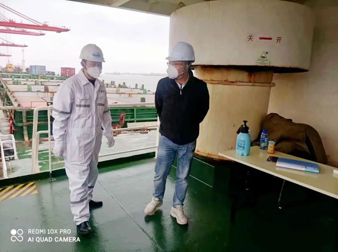 1月22日大年初一,江蘇遠(yuǎn)洋所屬通海航運(yùn)總經(jīng)理許永波、副總經(jīng)理管健及岸基相關(guān)部室負(fù)責(zé)人冒雨抵達(dá)南京龍?zhí)陡鄞a頭,登上停泊在碼頭的“江遠(yuǎn)集9”輪開展春節(jié)安全檢查,做好節(jié)日期間安全部署并慰問一線船員。