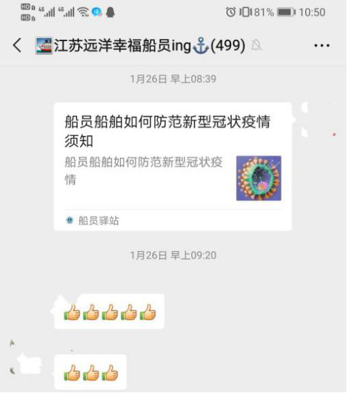 太倉海運(yùn)、中集東瀚、船員公司在公司的統(tǒng)一部署下,結(jié)合各公司業(yè)務(wù)情況及當(dāng)?shù)匾咔?,及時(shí)通過微信群、郵件等方式下發(fā)《太倉港集裝箱海運(yùn)有限公司新型冠狀病毒感染的肺炎疫情防控方案及措施》《中集東瀚新型冠狀病毒肺炎防控應(yīng)急預(yù)案》《船員公司加強(qiáng)預(yù)防新型冠狀病毒肺炎感染的通電》,確保公司黨委對(duì)防控工作要求傳達(dá)到每名船岸職工。