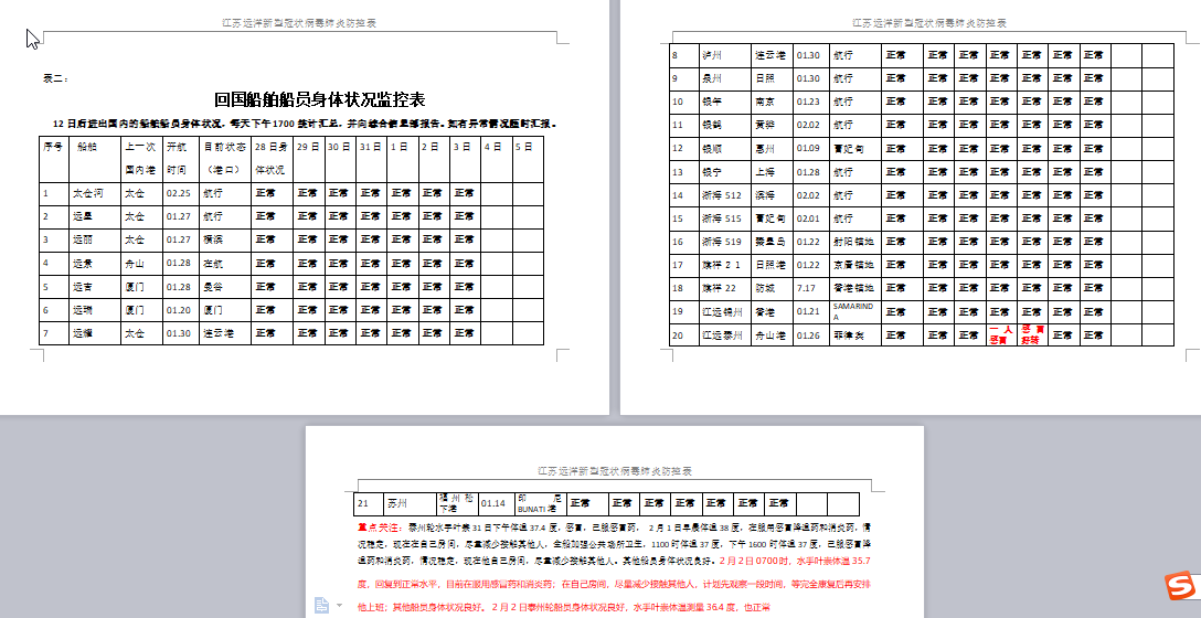 嚴格監(jiān)測排查。每天由專人負責對每名船員進行體溫測量,建立“防疫工作日志”。對有類似癥狀的船員,做好預防隔離,密切跟蹤身體健康狀況,并及時向公司通報船員癥狀。對于靠泊期間發(fā)現(xiàn)任何外來人員有類似感冒、咳嗽、發(fā)燒等癥狀時,立即驅離船舶并同時通知代理和工頭或有關管理部門處理。