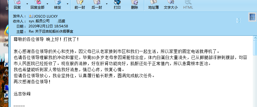 想著躺在病床上的母親,他坐立難安,緊急申請休假。公司立即安排他在太倉進行換班,但此時疫情防控形勢嚴峻,各地都實行封閉管理,不僅接班船長無法順利上船,張船長想要返鄉(xiāng)也是舉步維艱,換班計劃不得不取消。這個消息給大家心里蒙上了陰霾,如何幫助他度過這段特殊時期?公司岸基人員用行動給出了答案──溫情關(guān)懷暖人心,快速應(yīng)對保換班。船員公司負責(zé)人立即與張船長聯(lián)系,安撫并解釋當(dāng)前的情況,表示一定盡最大努力,為他家里提供幫助,并盡快安排他換班回家。用心,才能贏得信賴。張船長的心“踏實”了,說:“好吧,那就再堅持一個航次。”