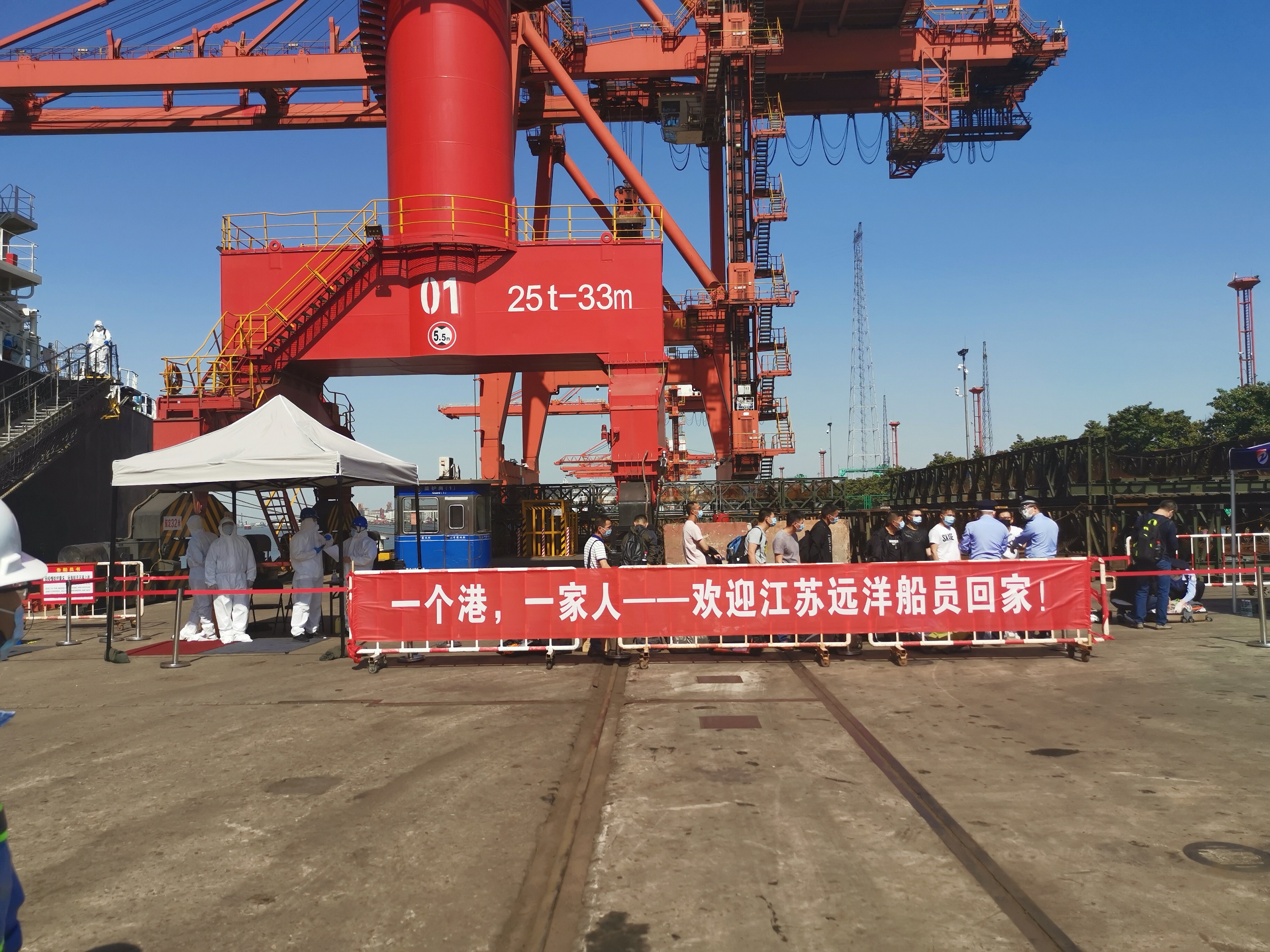 “一個(gè)港,一家人——歡迎江蘇遠(yuǎn)洋船員回家”,鮮紅的橫幅在碼頭上展開(kāi),休假船員們和在碼頭等候多時(shí)的船員家屬們看到這一幕,一個(gè)個(gè)流下了感動(dòng)的淚水。
