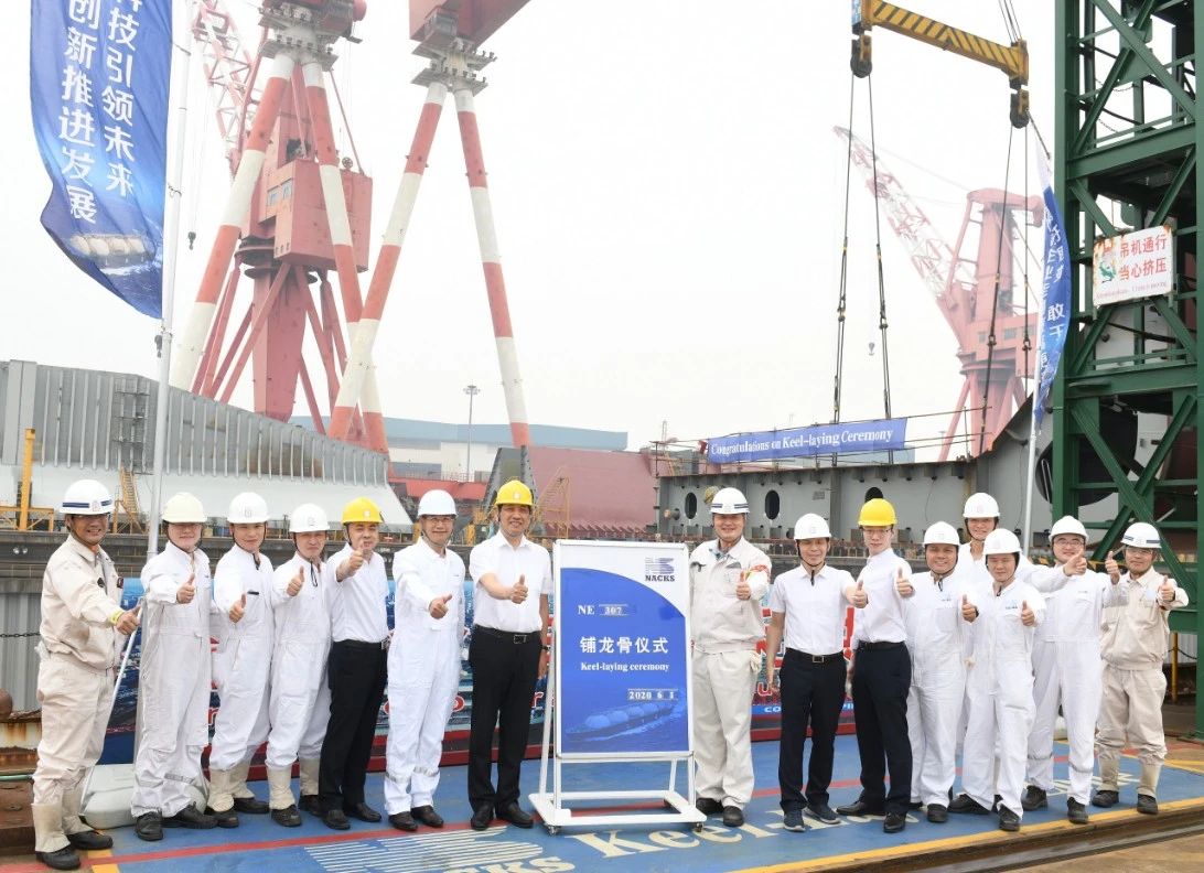 6月1日上午,江蘇遠洋在南通中遠海運川崎船舶工程有限公司投資建造的NE307船在1號船塢舉行鋪龍骨儀式。江蘇遠洋副總經理瞿名澤,NK船級社、南通中遠海運川崎相關領導出席儀式。