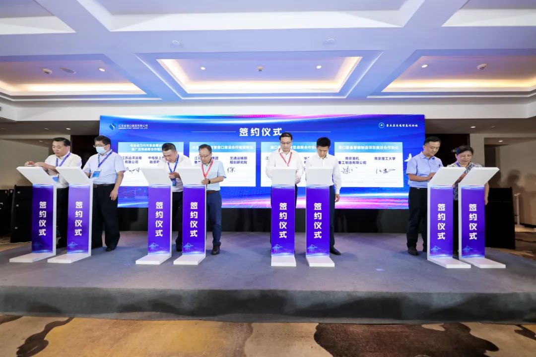 論壇上,江蘇省港口集團與華為技術(shù)有限公司簽署港口數(shù)字化轉(zhuǎn)型戰(zhàn)略合作協(xié)議,江蘇省港口集團集裝箱公司與交通運輸部規(guī)劃研究院簽署太倉港集裝箱智慧港口建設(shè)合作框架協(xié)議,江蘇遠洋與中電投上海融和電科融資租賃有限公司簽署電池動力內(nèi)河集裝箱運輸舶船推廣應(yīng)用戰(zhàn)略合作框架協(xié)議,南京港機重工公司與南京理工大學(xué)簽署港口裝備智能制造項目規(guī)劃合作協(xié)議。