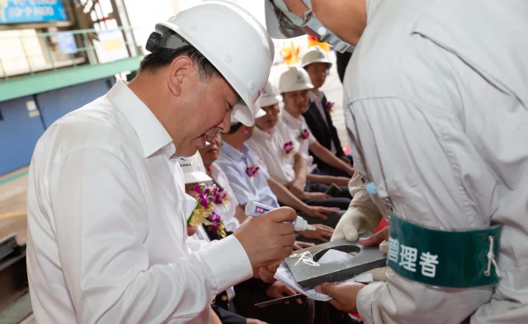 江蘇遠(yuǎn)洋所屬太倉海運(yùn)與常石舟山船廠簽訂3艘1091TEU集裝箱船(SS297/298/299)投資建造合同。6月30日上午,第一艘1091 TEU集裝箱船SS297在常石舟山船廠青山加工車間舉行了開工儀式。常石舟山造船總經(jīng)理佐藤二郎等廠方代表,NK船級社中國公司總裁東史彥等NK船級社代表,江蘇遠(yuǎn)洋黨委書記、董事長晁陽等船東代表,三方領(lǐng)導(dǎo)代表出席了開工儀式,共同見證這一重要時刻。